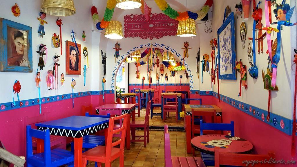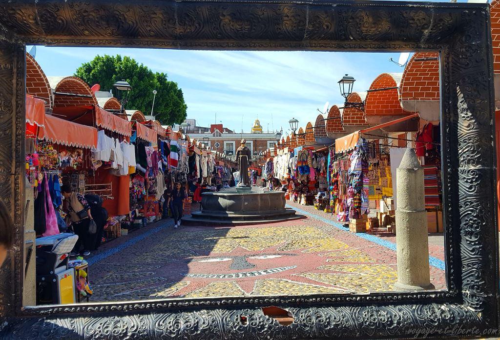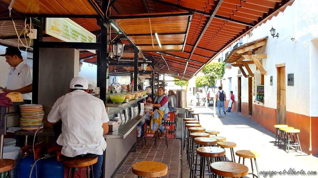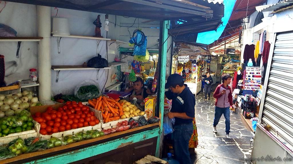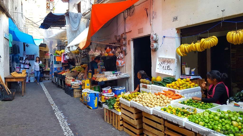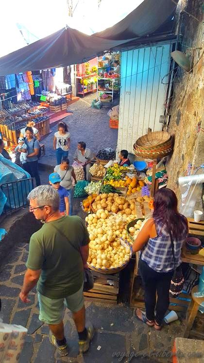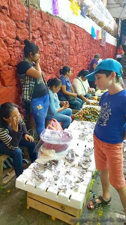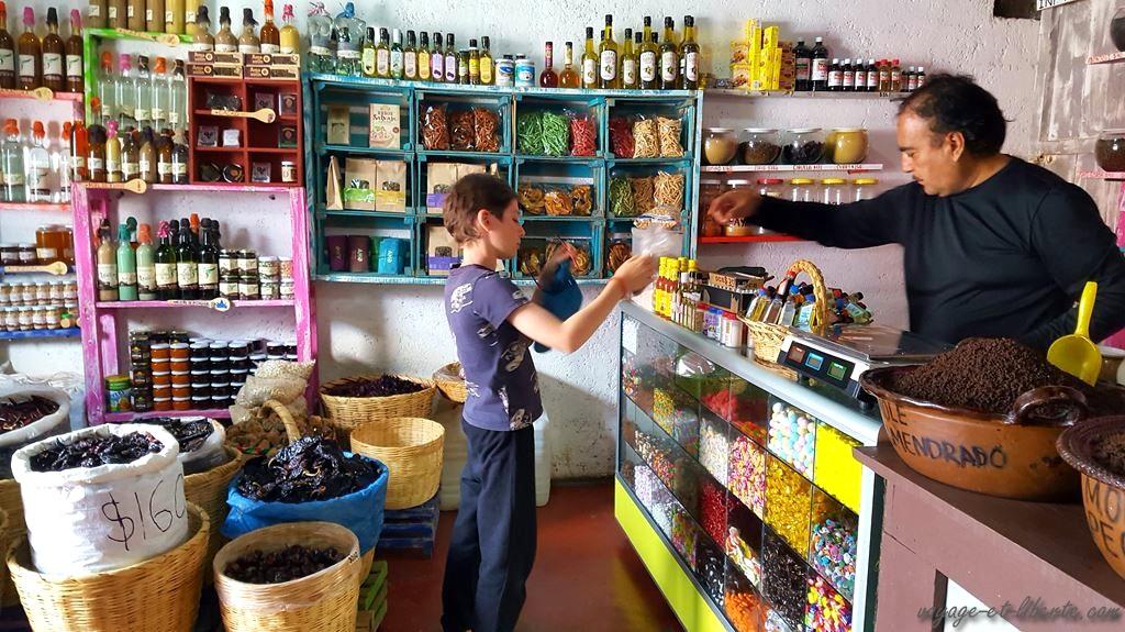 Avant de finir écrasés comme l’un des milliers de clébards transformés en carpettes qui gisent sur le bord des routes mexicaines, nous opérons un retrait stratégique au marché. Enfin une zone piétonne ! Et pour cause, celui-ci est un véritable labyrinthe géant occupant ruelles et escaliers de tout un quartier. On dirait presque un souk marocain. Il fait bon s’y perdre que ce soit pour acheter des bijoux en argent, des victuailles ou … des sacs de punaises vivantes ! Les vendeuses ont eu beau essayer de nous convaincre d’en croquer une ou deux pour goûter, nous avons lâchement renoncé !