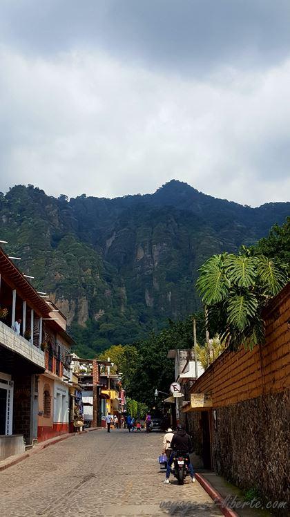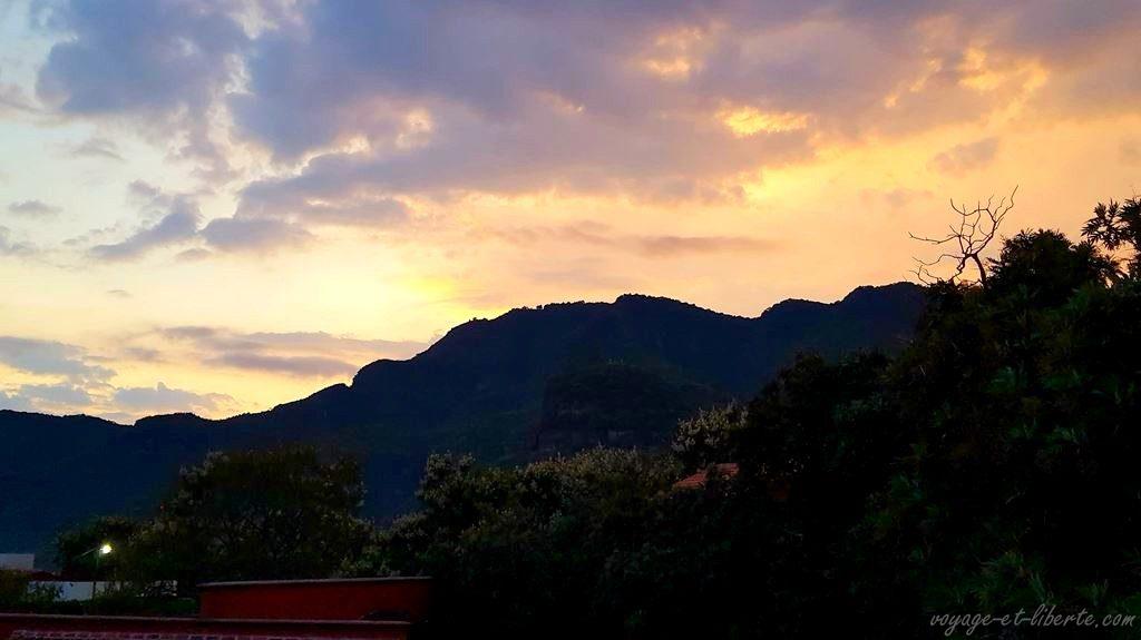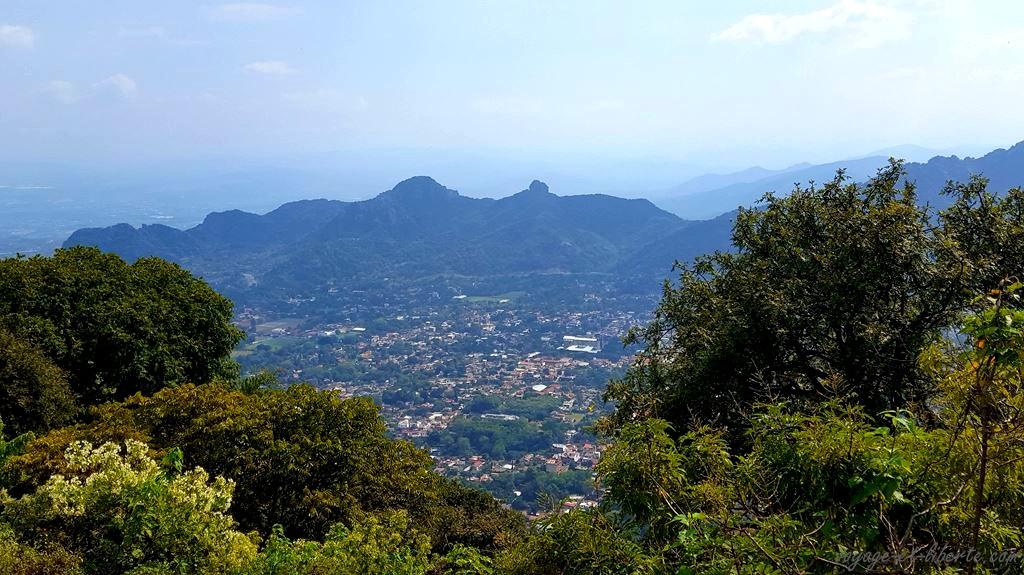 Premier arrêt : le génial village de Tepotzlan blotti dans un superbe cirque de montagnes. Comprenant qu’y circuler avec notre monstre va être impossible, nous l’abandonnons à l’entrée (on progresse, on progresse!). On a vaguement lu qu’une pyramide se cache au sommet d’une des montagnes et que le vue y est splendide. Ce que nous ne savons pas, c’est que le chemin est composé de milliers de marches et grimpe à pic. Même l’orage qui menace ne nous arrête pas. Une heure plus tard, trempés comme des soupes, nous parvenons à la pyramide. C’est beau. Et le panorama aussi ! Mais, qu’est-ce que ça monte !!!