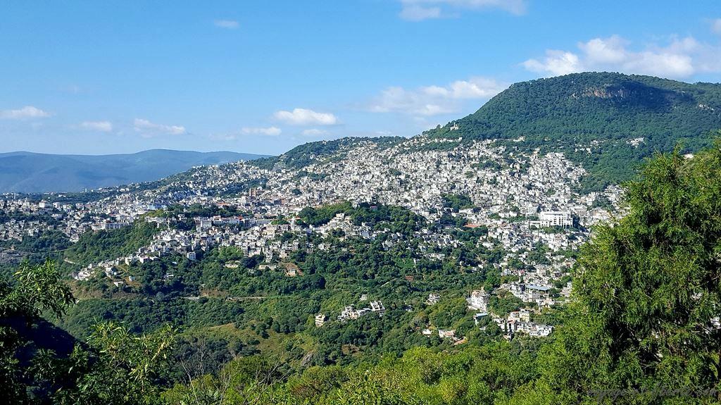 Au matin, nous partons pour visiter la ville de Taxco. De cette dernière nous ne savons rien, mais en arrivant au mirador de l’autoroute la surplombant, nous comprenons qu’il nous sera impossible d’y circuler en CC. En effet, Taxco cascade du haut jusqu’au bas d’une montagnette, ses maisons blanches semblant accrochées comme elles le peuvent aux flancs de cette dernière. Gloups … Pas question d’y jeter le monstre dedans. Nous le stationnons là pour la journée et appelons un taxi pour finir le trajet. Décidément, nous nous améliorons hihi.