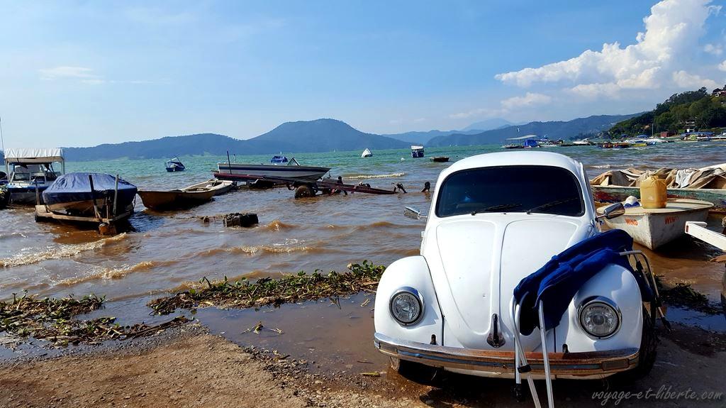 Pour nous remettre, nous partons dormir au bord du lac de Valle de Bravo. Le seul endroit que nous trouvons pour garer le monstre et passer la nuit est un storage-camping-un-peu-cracra à San Gaspar. Abstraction faite du décor immédiat, ce qui nous plaît immédiatement, c’est qu’ici, on se croirait dans les Alpes. Tout rappelle leurs paysages : les montagnes boisées, le lac, les villages mignons …