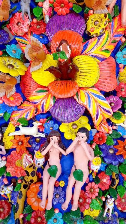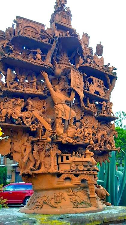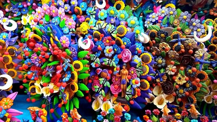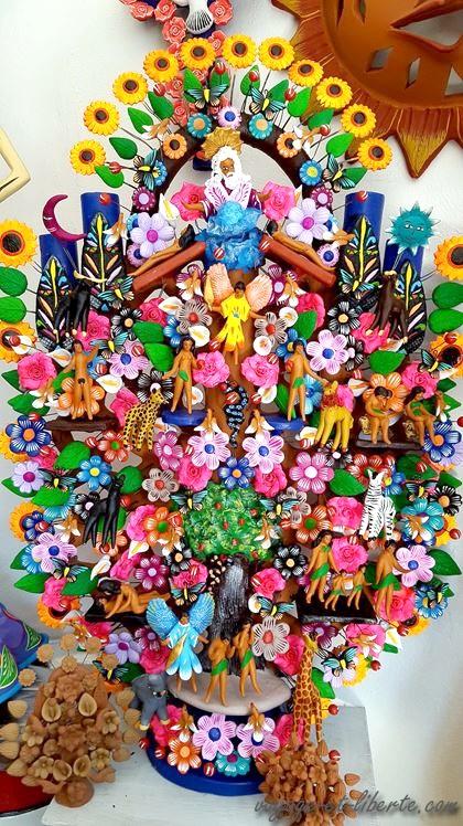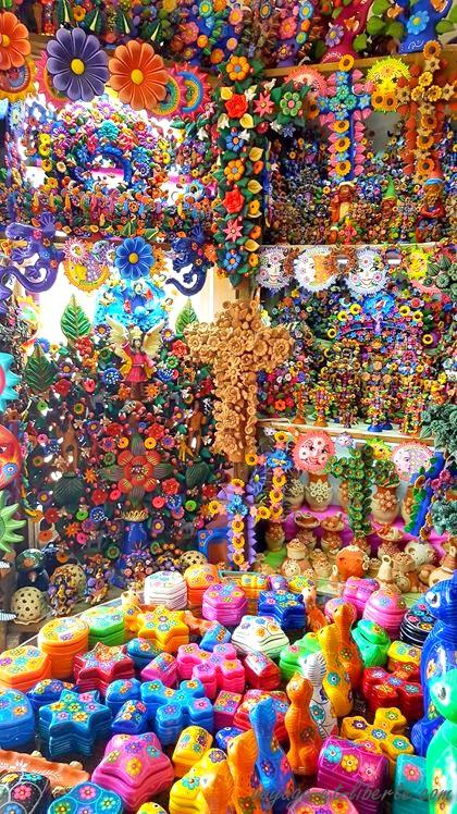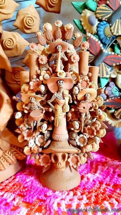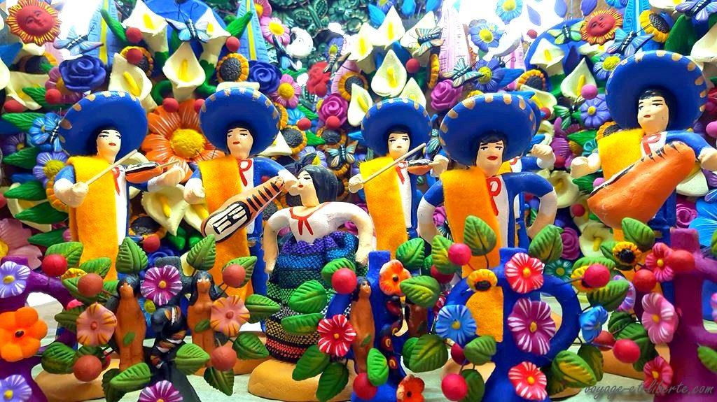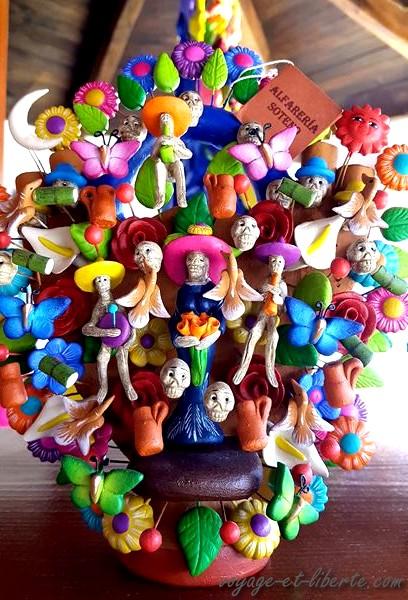 En route pour Metepec, petite ville dans la banlieue de Toluca. 100 bornes et l’équivalent de 20 euros de racket péages plus tard (au Mexique j’ai un peu l’impression d’être revenue au temps de la féodalité, quand chaque route comportait un péage destiné à enrichir le seigneur du coin. Quelque chose me dit qu’on n’est ici pas loin du compte…), nous y arrivons. Ne cherchez pas à Metepec un village pittoresque, car il est assez quelconque. Son intérêt est ailleurs, dans son artisanat. On y fabrique de délicieuses compositions en terre cuite, appelées arbres de vie, que je lorgnais depuis un bon moment. C’est hyper kitsch, mais j’adore !