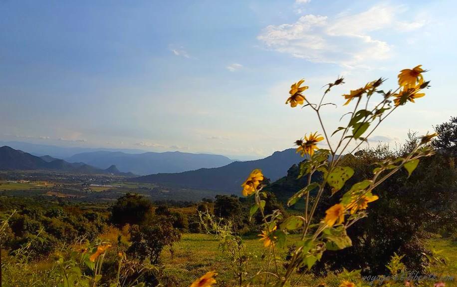 Après avoir dormi dans une rue quelconque, nous reprenons un labyrinthe de routes fleuries pour nous rendre aux ruines de Xochicalco.