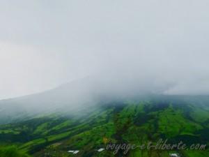 Il faut dire que des volcans nous en avons vu tant et plus depuis 9 mois. Bien sûr nous aurions adoré contempler les volcans équatoriens, dont certains sont en « active activité », mais ces derniers sont enrobés dans une couche de nuages si épaisse qu’on ne peut même pas deviner leur existence en passant à côté. Ainsi, nous n’avons pas vu le Chimborazo, pas plus que le Tungurahua qui domine Banos… A peine a-t-on cru le voir, nimbé de brume. Seule la cendre sur la route témoigne de sa proximité.