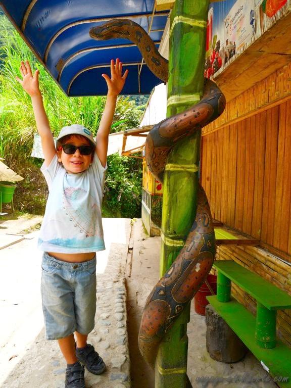 Quand nous étions en France, Charles avait visionné une vidéo où des voyageurs faisaient de la tyrolienne en Amazonie équatorienne. Depuis 9 mois, il attendait fébrilement le moment où nous y serions. Nous pas du tout. Et moi encore moins car j’ai le vertige.