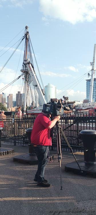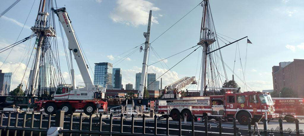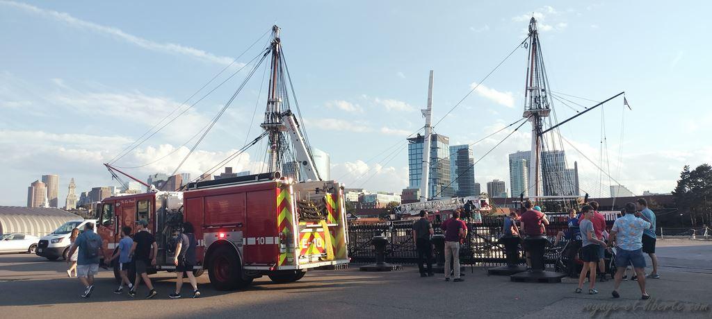 Nous nous approchons des bateaux « musées » et comme toujours tombons à pic : une dizaine de camions de pompiers et une grue nous barrent la vue sur le USS Constitution, une belle frégate de 1797 (c’est le plus vieux navire de guerre encore à flot au monde). Que se passe-t-il donc ?! La dernière fois que nous avons vu un truc bizarre de façon impromptue, c’était un bébé bison égaré sur une route de Yellowstone. Il fit ensuite la une des journaux US pendant plusieurs jours (voir mon article sur Yellowstone). Mais ici ? L’arrivée rapide des télés et le survol du bateau par des hélicos nous laissent penser que la situation est grave. Attentat ? Attentat commis par un bisonneau ? Incendie ?