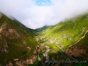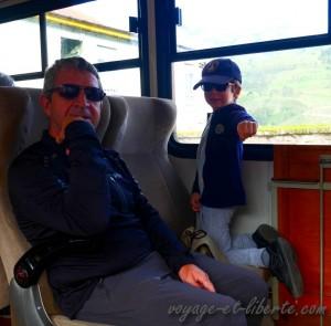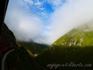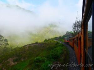 Immédiatement après le départ, le train « plonge » dans la vallée et les nuages. Les villageois sont aussi contents de voir passer le train que nous sommes satisfaits d’être à l’intérieur de celui-ci !