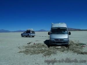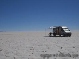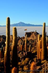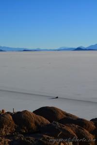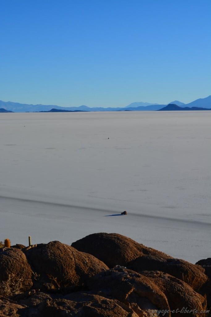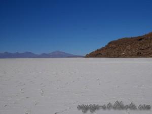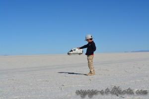 Il faut vous imaginer une immense étendue de sel, grande comme deux départements français, et qui abolit complètement toute notion de distance ! Les montagnes qui l’entourent sont à plus de 100 kms et pourtant, on croirait pouvoir les toucher du doigt ! Incroyable !