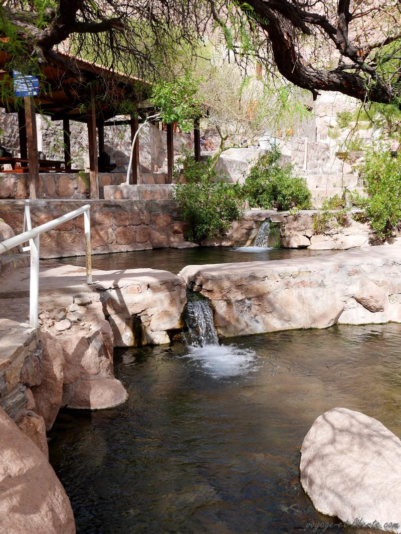 Nous savions vaguement que Fiambala a été plusieurs fois une ville étape du Dakar, ce que nous ignorions c’est que Fiamabala offre aussi de magnifiques thermes au coeur de la montagne. Dominant le désert de sable blond, ils se lovent au coeur de roches ocres et roses, plusieurs bassins s’échelonnant du sommet au point le plus bas. Charles adorant se baigner, nous avons donc fait un modeste détour de 250Kms AR pour y passer un long moment. Sans regrets ! Les bassins offrent en effet des eaux entre 48 et 24 degres ! Dans celui a 38 nous etions comme des poissons dans une soupiere !