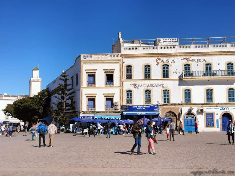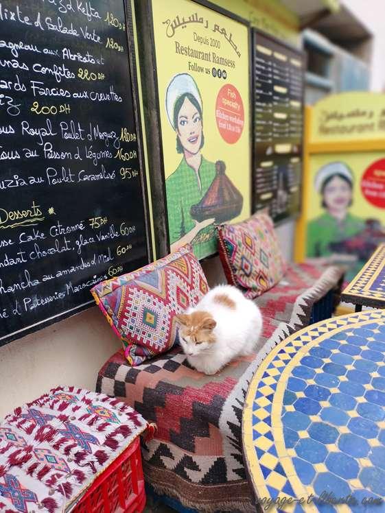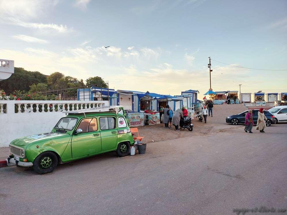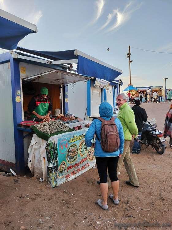 Et arrivons sur la place centrale où, dans un coin, les restos de pêcheurs te préparent des assiettes de poissons frits environ 4 à 5 fois plus chères qu’à Rabat pour une quantité équivalente. Les poissons ont ici remplacé les poules aux oeufs d’or !