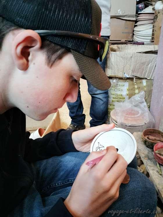 Une fois cuits dans un four à bois, les objets sont peints. C’est pas facile de respecter une forme comme s’en rend vite compte Carlito !