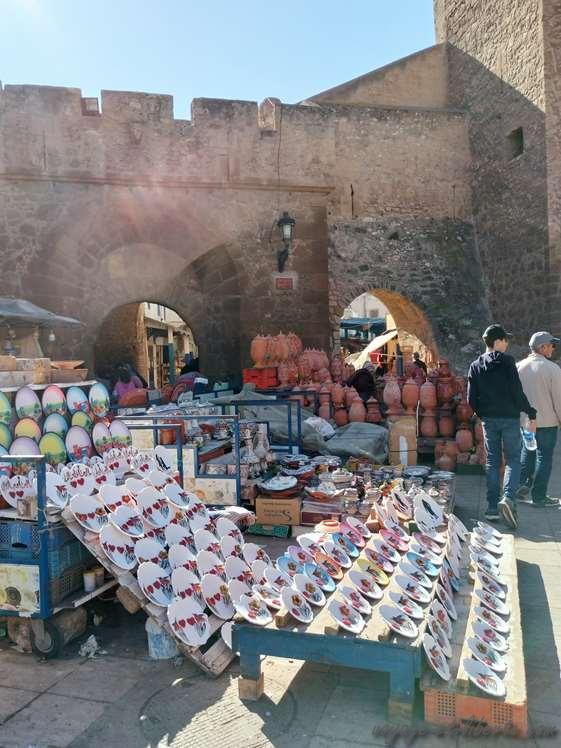 Après avoir traversé la ville nouvelle, nous stationnons à proximité de la médina ancienne et de ses remparts. Pas un touriste à l’horizon. Nous ne nous méfions donc pas quand une nouvelle bande adhésive vient se coller à nous. Un gars nous a repérés et il tient à tout prix à nous « rendre service » (comprenez nous balader chez tous ses potes commerçants). Nous acceptons de bonne grâce car, en ce dimanche, nous ne trouvons aucun resto ouvert et avons besoin d’aide (sans penser qu’il nous collerait tout le reste de la journée) …