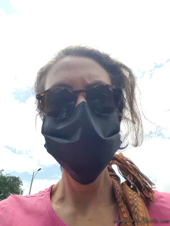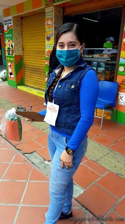 9h 57 : je traverse la place vide. Une jeune fille me redemande ma cedula et inscrit mon identité sur sa fiche. Je vois bien qu’elle trouve mon masque « home made by mi vecina » un peu rigolo. Elle m’en propose un, un peu plus officiel. J’accepte avec reconnaissance, le ridicule attaquant ma dignité.