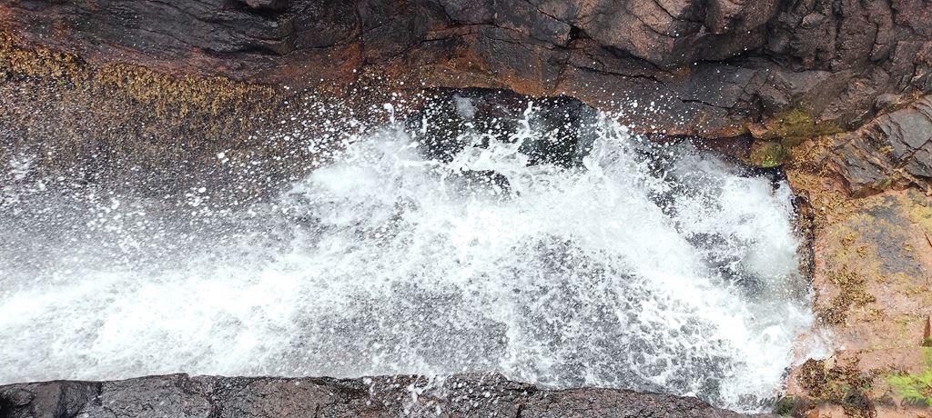 En s’approchant de celle-ci, nous constatons que beaucoup de gens s’amassent sur un pont pour la regarder couler. Elle doit probablement charrier des tonnes de homards ?! En fait, c’est autre chose : elle est juste totalement déchaînée.