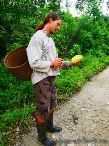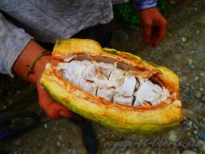 Juanito nous coupe du cacao. Nous suçons avec délice le mucilage blanc très sucré et goûteux qui entoure les fèves, le goût ressemblant à celui d’un litchi. Fermenté, il se transforme en vin de cacao, également excellent. Les graines, quant à elles, seront mises à sécher pour devenir un jour du chocolat.
