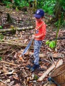 Au petit matin, le doigt va beaucoup mieux, tout comme son propriétaire. Le jeune couple nous emmène voir le travail des champs. L’un et l’autre bouturent du manioc pour étendre les futures plantations. Ici, les gens vivent d’une agriculture raisonnée afin de ne pas porter préjudice à la forêt qu’ils respectent. Aussi, d’autres initiatives économiques ont été prises pour assurer la survie de la communauté, comme la menuiserie dans du bois de second choix ou la fabrication de savons naturels.