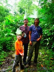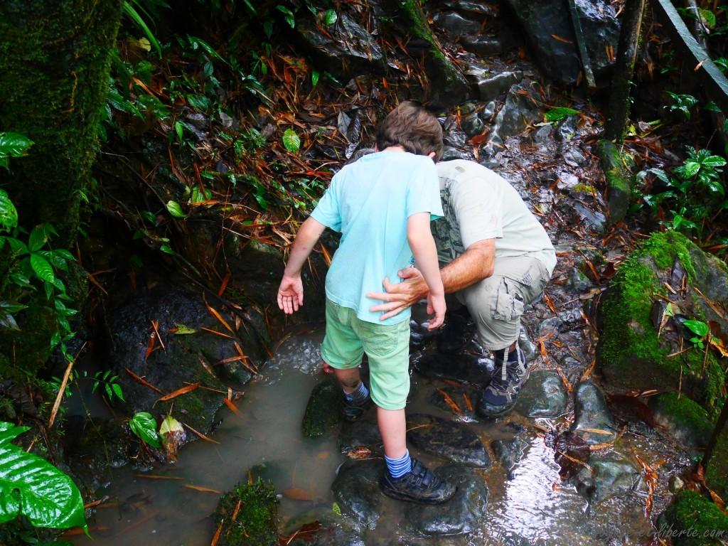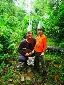 En revanche une pluie diluvienne recommence à tomber et, cette fois, la forêt ne parvient pas à nous en abriter. Nous passons donc 4 heures à marcher sous une douche tiède, même pression qu’à la maison, température d’eau idéale (environ 28 degrés). Il ne manque plus que le savon. Carlito est très brave, avec sa coiffe de guerrier. Il fait l’aller retour sans se plaindre, émerveillé par les gros 1000 pattes qui courent un peu partout et par les orpailleurs que nous croisons au creux d’une rivière.