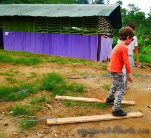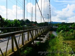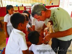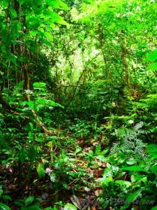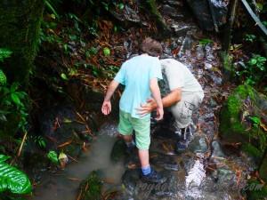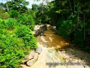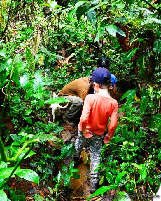 L’après-midi, nous engageons un jeune guide du village pour nous faire faire un tour dans la jungle. La contribution financière est modique, puisqu’il nous demande 10 dollars la demie journée. Nous nous enfonçons dans la forêt luxuriante, dense, boueuse. Il faut tailler le chemin à la machette. Nous glissons à chaque pas, manquant de tomber nez à nez avec des petites bestioles peu appréciées des phobiques !