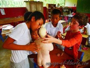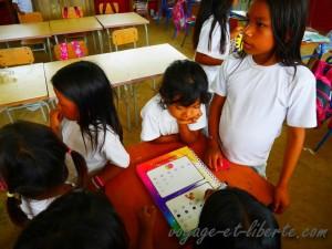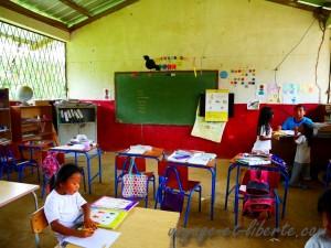 Nous les abandonnons pour nous rendre à l’école du village. 17 enfants y travaillent, toutes les classes étant représentées de l’équivalent du CP à celui du CM2. Pour s’en occuper : un seul maître officiant dans une seule et même salle 5 jours sur 7 de 7h30 à 12h30 ! Gros boulot donc pour ce dernier qui doit apprendre à ses élèves deux langues (le castillan et le quechua) et des rudiments d’anglais aux plus grands, sans compter les autres matières ! Le matériel est rudimentaire, puisque le maître doit lui-même dessiner sur le cahier de chacun des enfants les images qu’il entend leur faire colorier…