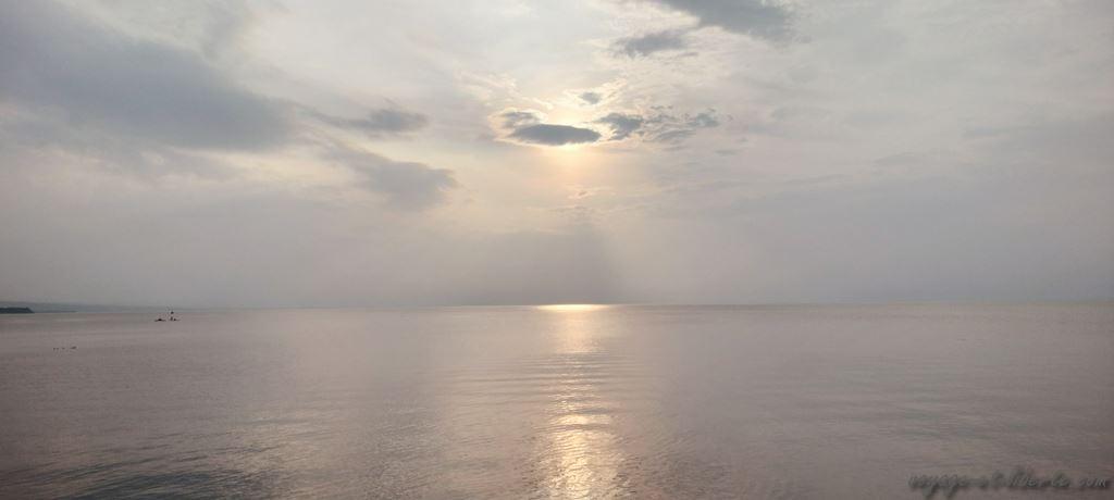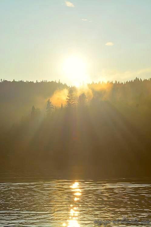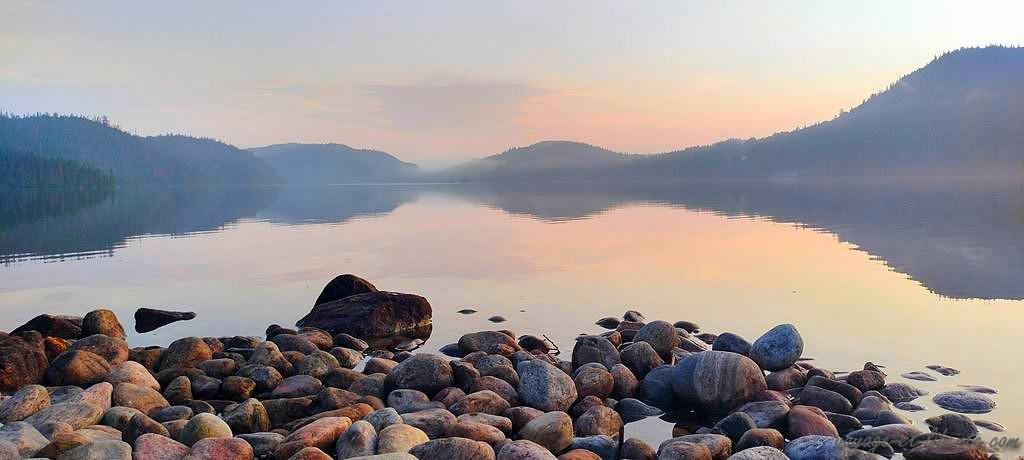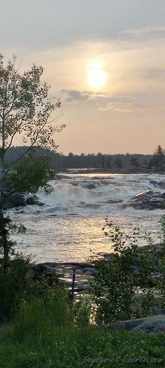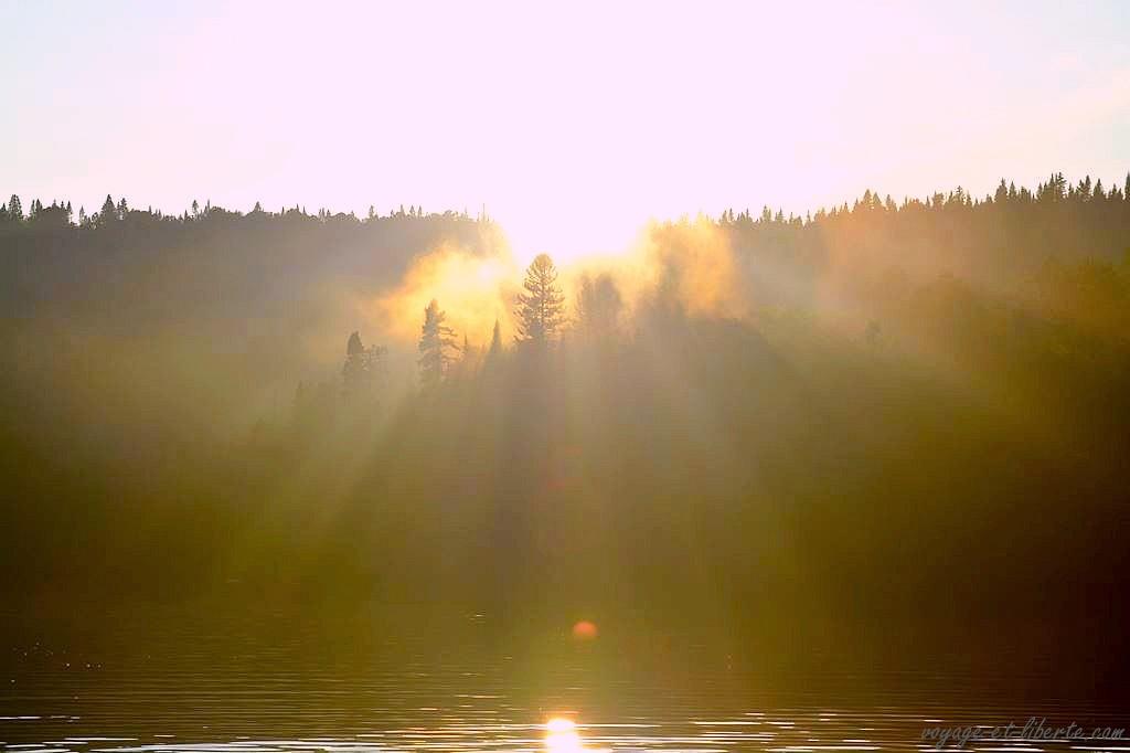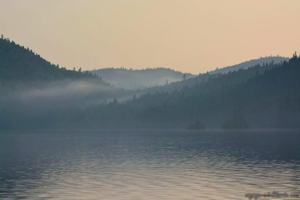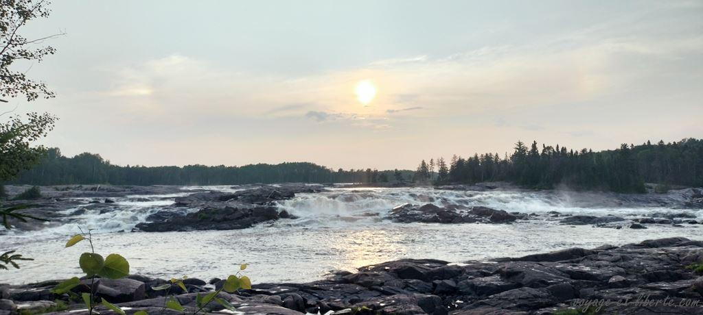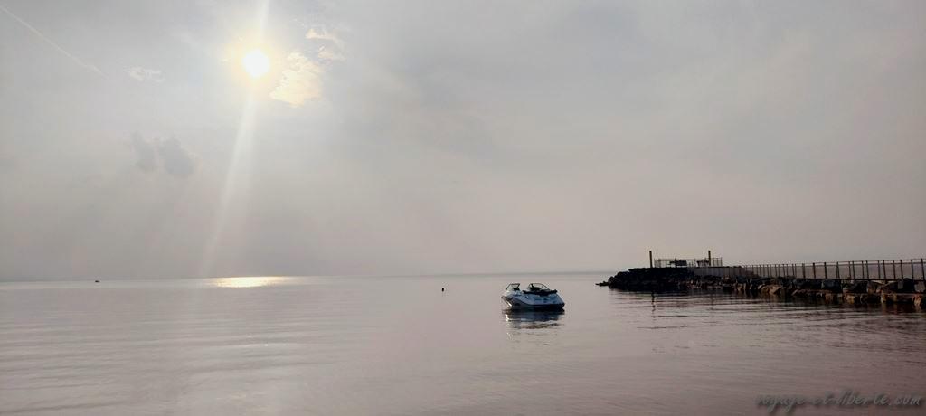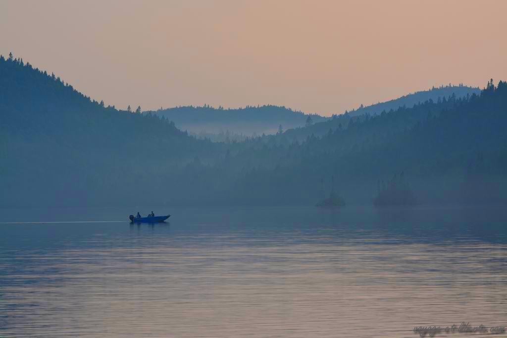 En fin d’aprem, dévorés, nous arrivons au lac Saint-Jean baigné par les fumées d’incendie.