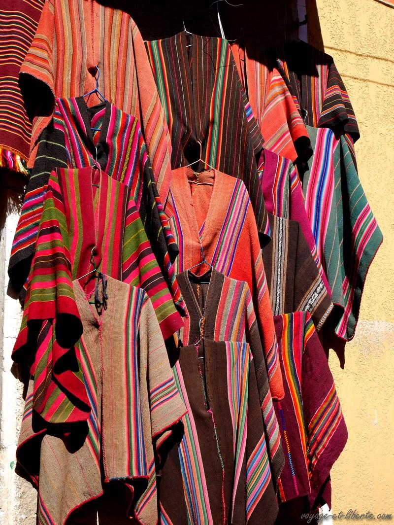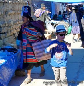 Comme le marché est normalement touristique, je redoute un peu de retrouver l’équivalent andin du « tissu olives-tournesols, des herbes de Provence, de la cigale en plâtre qui fait cri-cri-cri quand on passe devant ou du bouquet de lavande, le tout made in China » que servent les marchés provençaux aux étrangers de passage.