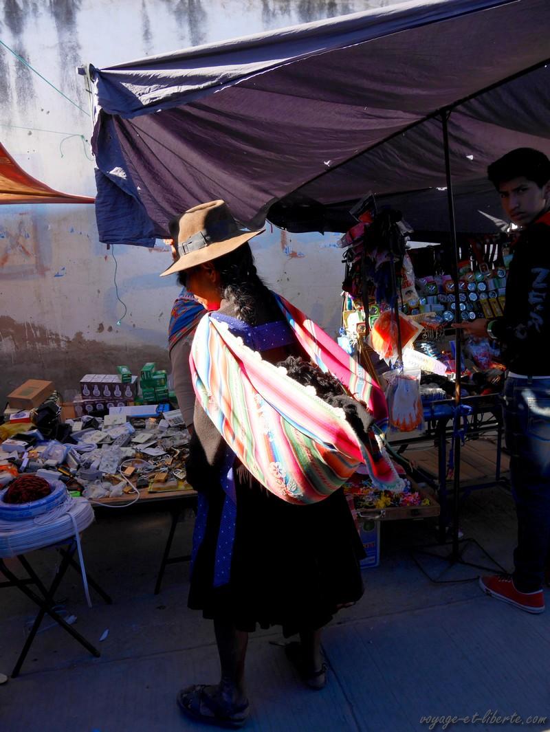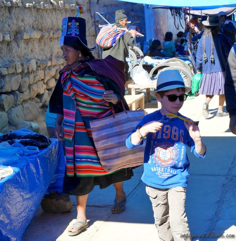 En fait, excellente surprise, c’est avant tout un marché pour les locaux en magnifiques tenues quechua. Nous passons une très belle journée à les observer. Et prendre des photos (y a pas de raison, les mêmes ne se sont pas privés la veille de nous détailler des pieds à la tête, n’hésitant pas à me demander ce que j’avais dans les poches !!)