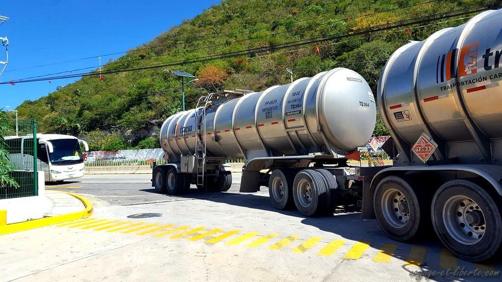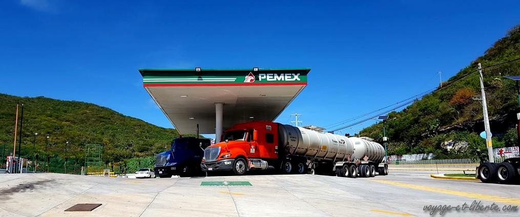 80 bornes, 100 bornes, 150 bornes, 190 bornes … Toujours rien et nous sommes presque à sec ! Aucun panneau, aucune indication ! Même en Islande, ils mettent des panneaux pour te prévenir que la prochaine station sera dans 256 kms de piste. Mais pas au Mexique ! Au Mexique, tu paies la peau des fesses ton autoroute, mais on se garderait bien d’y mettre des stations ou, au pire, de préciser qu’on n’en trouvera pas. Bref, au bout de tous ces kms, nous nous ruons sur l’unique sortie rencontrée depuis Cuernavaca-sud, roulons encore 10 bornes, pour mettre la main sur la seule station de la région. Qui ne vend pas de diesel. La blague ! Sympa, le pompiste nous apprend qu’il nous faudra refaire 60 kms en direction du nord pour en trouver. Dans le CC, c’est la consternation !