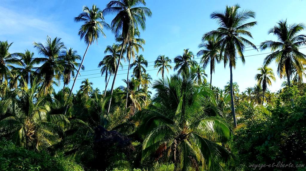 Quand nous quittons l’autoroute, crevés, il nous reste 120 bornes à faire avant la nuit qui arrive à grand pas. Les paysages ont changé. S’il est absolument impossible d’apercevoir le Pacifique que nous pressentons pas loin, nous croisons en revanche de magnifiques champs de papayers ou de cocotiers. Pourtant, en dépit de la beauté du paysage, la tension monte dans le CC : nous n’en finissons pas de ne pas avancer. Chaque hameau ou village -et ils sont nombreux – est parsemé de « topes ». Parfois 8 d’affilée sur 500 mètres. Et à chaque « tope », tout le CC et ses habitants sont secoués comme des pruniers. On va finir par tout casser ! L’horreur ! Il nous faudra 3 heures pour parcourir les 120 kms de route parfaitement rectiligne … Et tout ça pour aller voir des plages ! Nous commençons à regretter un peu notre choix inhabituel !!!