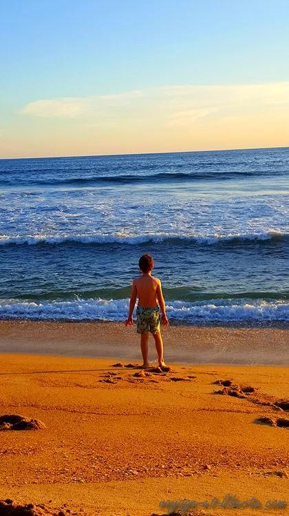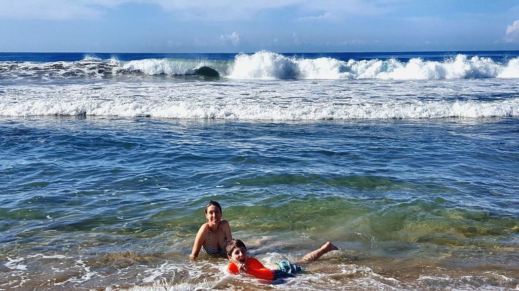 Ce que nous faisons. Trouvant sur la plage un endroit où les courants semblent plus calmes, nous barbotons un moment au bord du rivage, toujours pas convaincus de la possibilité de nous lancer dans les vagues sans planche de surf.