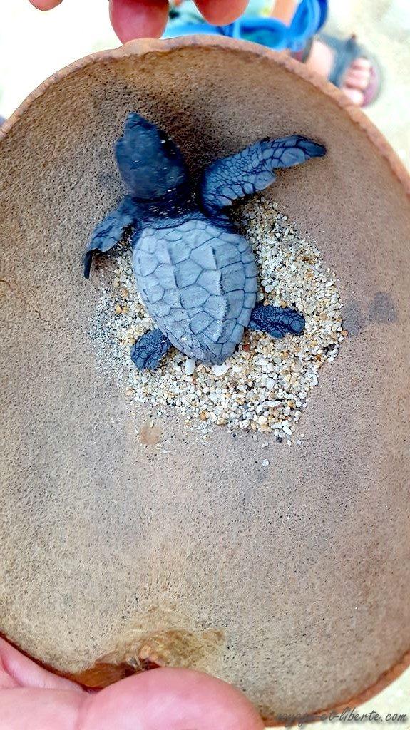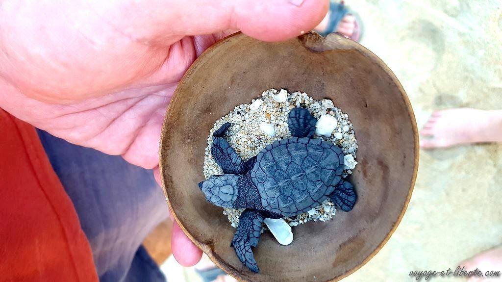 Tout est très bien organisé. Nous apprenons plein de choses sur les moeurs des tortues, capables au bout de 15 à 20 ans de retrouver leur plage natale, pour venir y nicher à leur tour. Et puis, chacun avec un bébé tortue dans une coquita de noix de coco, nous nous approchons de l’océan pour les laisser filer dans celui-ci. Le spectacle est très émouvant. Certaines, comme la Bip-bip de Jérôme, fonce à l’eau, bravant des énormes vagues. D’autres, plus endormies, comme la Charly ou la Caroline de Carlito et moi-même, n’y vont qu’à reculon.