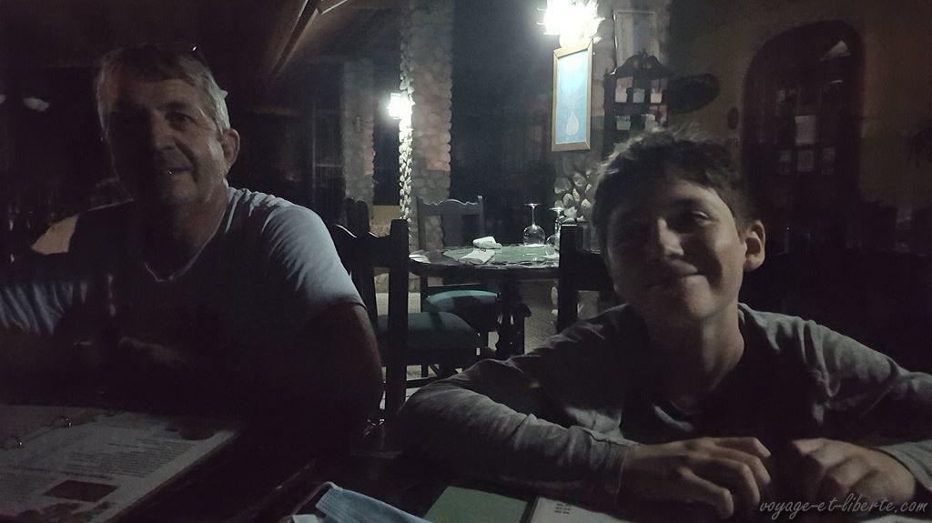 Il pleut et il fait nuit. Nous partons dîner à pied dans un village qui s’organise autour d’une trrrrès longue rue, sans centre-ville. L’éclairage public est défaillant. Ambiance. C’est avec un certain soulagement que nous trouvons par hasard un resto ouvert. En plus, il a l’air sympa et le menu nous plaît ! Hourra ! A peine avalée une délicieuse première gorgée de bière qu’une coupure générale de courant plonge le village dans le noir… Incroyable. Enfin pour nous, car la dame du resto nous apprend que cela fait partie du folklore local. Et, en effet, un quart plus d’heure, la lumière refait son apparition. Aaaarf ! J’ai rarement vu un pays aussi mal tenu !