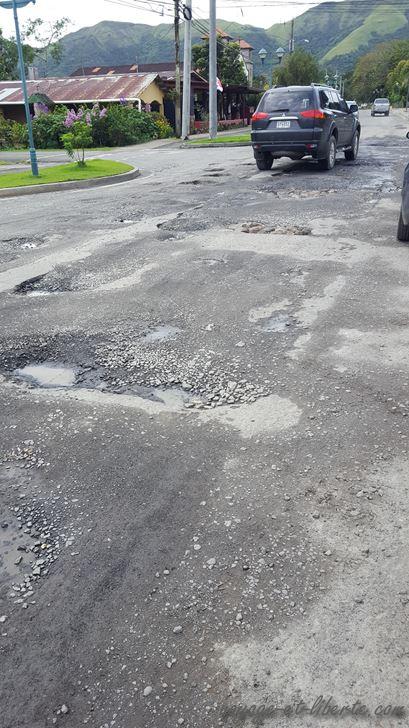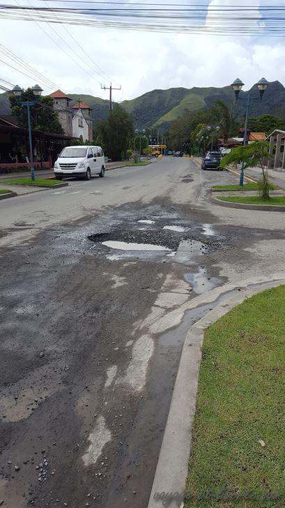 Pfff … je ne sais pas si c’est la malédiction du vendredi 13 qui nous poursuit, mais nous arrivons sous la pluie et le brouillard à El Valle. La route qui permet d’y accéder, tout comme son axe central, sont littéralement défoncés. A tel point que je finis par me demander si les voies n’ont pas été canardées à coups de mortiers : le goudron est entièrement parsemé de profonds trous…