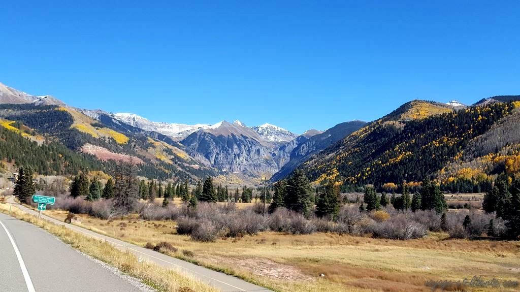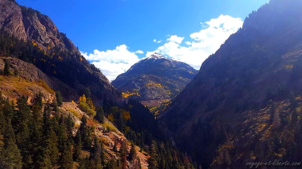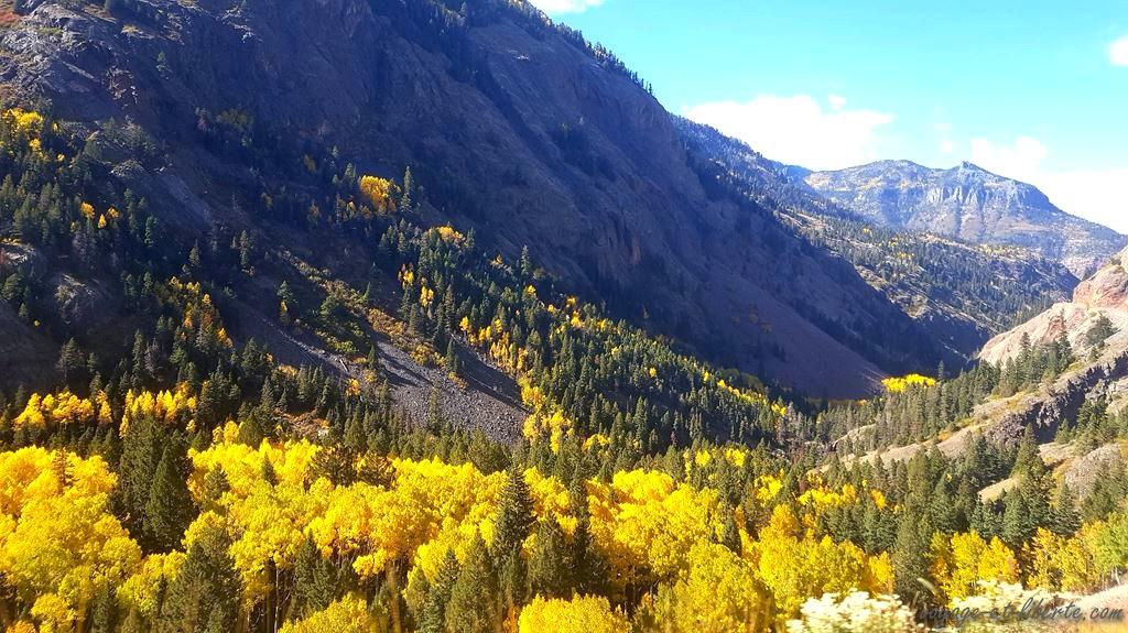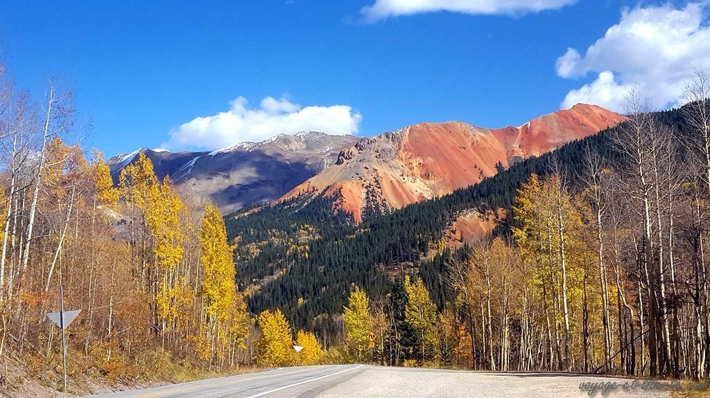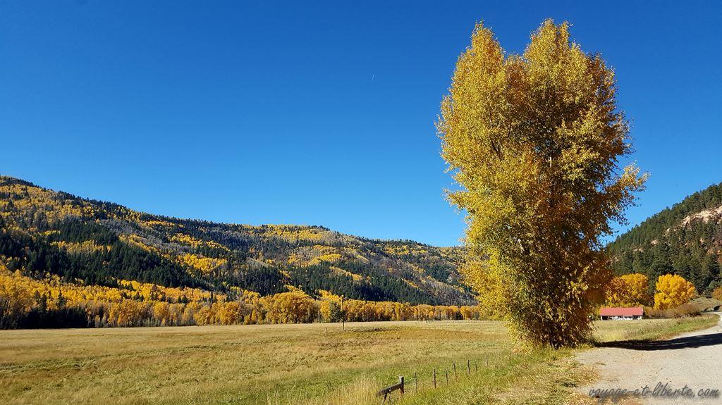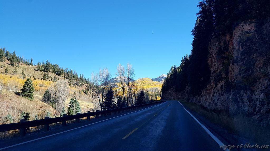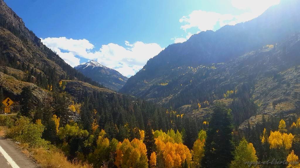 A la sortie d’Ouray, la route devient plus étroite encore. Avec ses couleurs automnales, elle est flamboyante. Je ne sais pas s’il coula un jour ici des flots d’or, mais aujourd’hui c’est l’or végétal des feuilles qui donne toute sa beauté à l’endroit.
