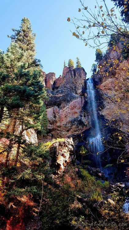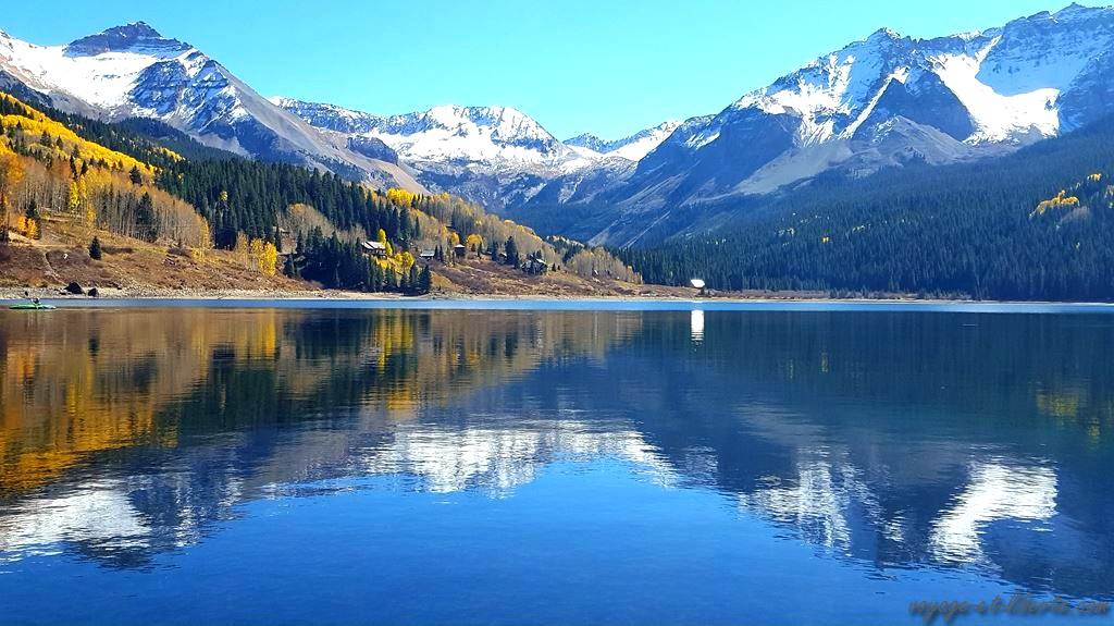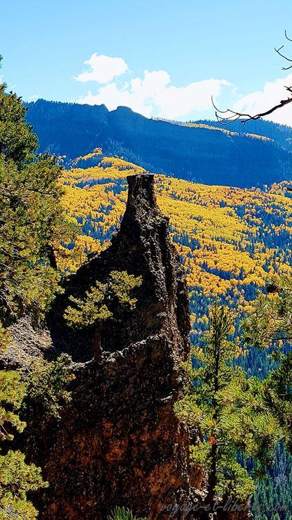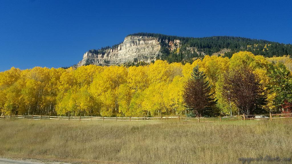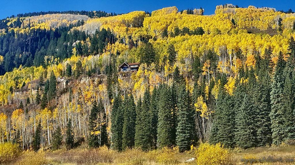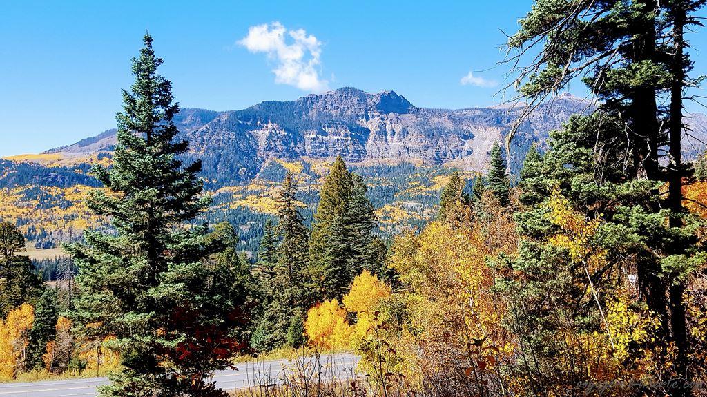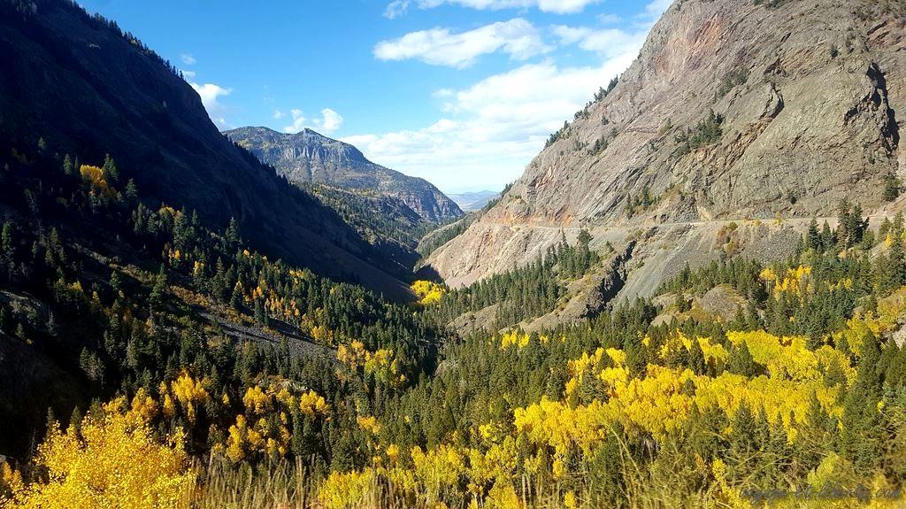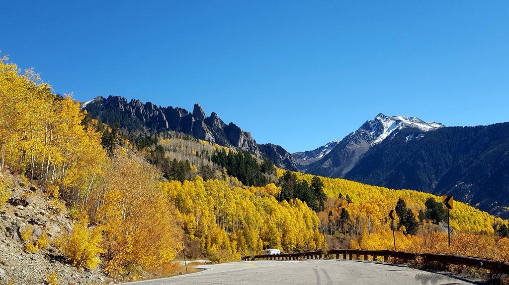 A la sortie d’Ouray, la route devient plus étroite encore. Avec ses couleurs automnales, elle est flamboyante. Je ne sais pas s’il coula un jour ici des flots d’or, mais aujourd’hui c’est l’or végétal des feuilles qui donne toute sa beauté à l’endroit.
