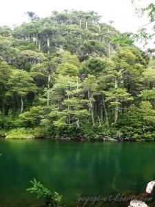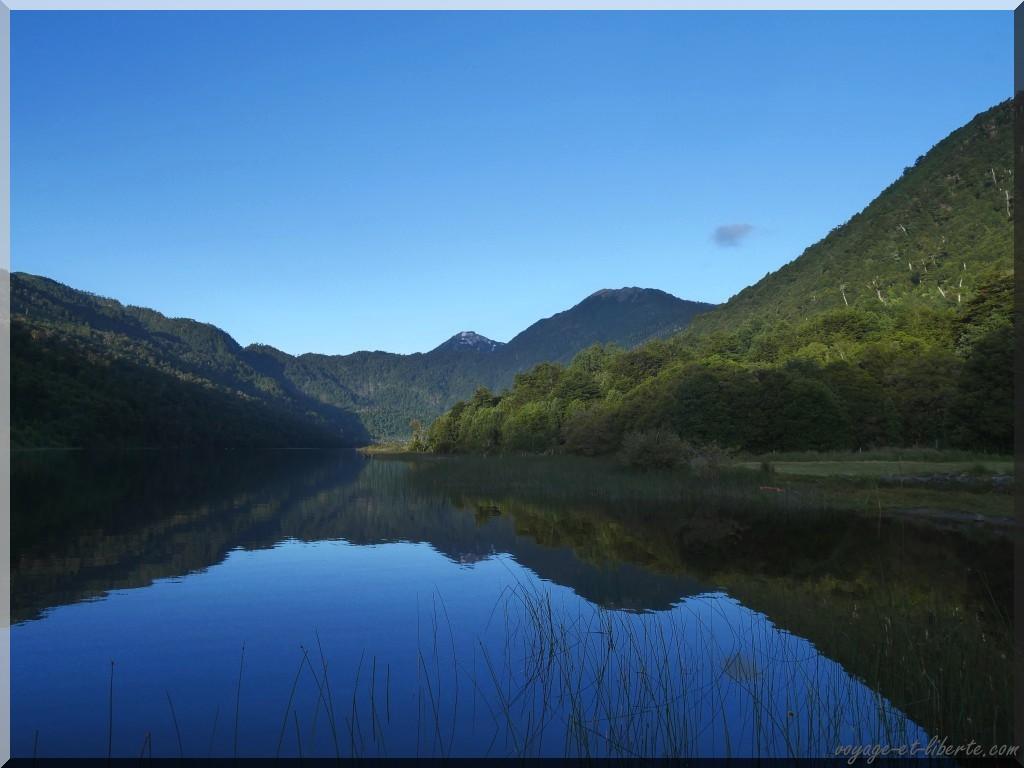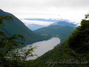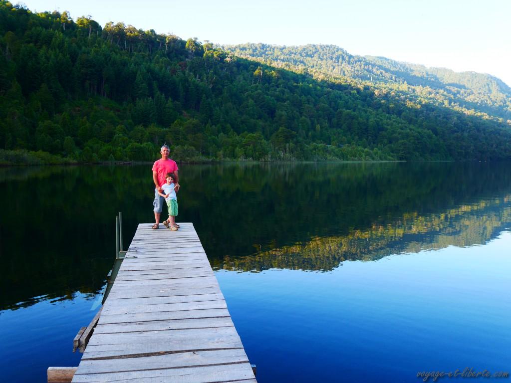 Au loin, très loin au bout d’une piste en état bolivien, donc souvent défoncée. Il paraît que là aussi le gars de la niveleuse est en vacances. Jolie étendue d’eau avec ses piverts et ses araucanias qui semblent tout droit sortis de la préhistoire. Nous y rencontrons une famille de voyageurs français très sympa, Olivier, Adeline, leurs enfants Thomas et Alexis et leurs grands-parents. Nous passerons la soirée ensemble devant la plage du lac à partager des bières et des tuyaux de voyage.