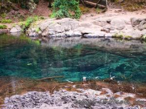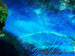 Regardez bien ! Non seulement l’eau est d’une transparence absolue, non seulement sa couleur oscille entre le bleu saphir et le bleu turquoise, mais tout au fond se trouvent des arbres pétrifiés par une ancienne éruption datant de plusieurs centaines d’années.