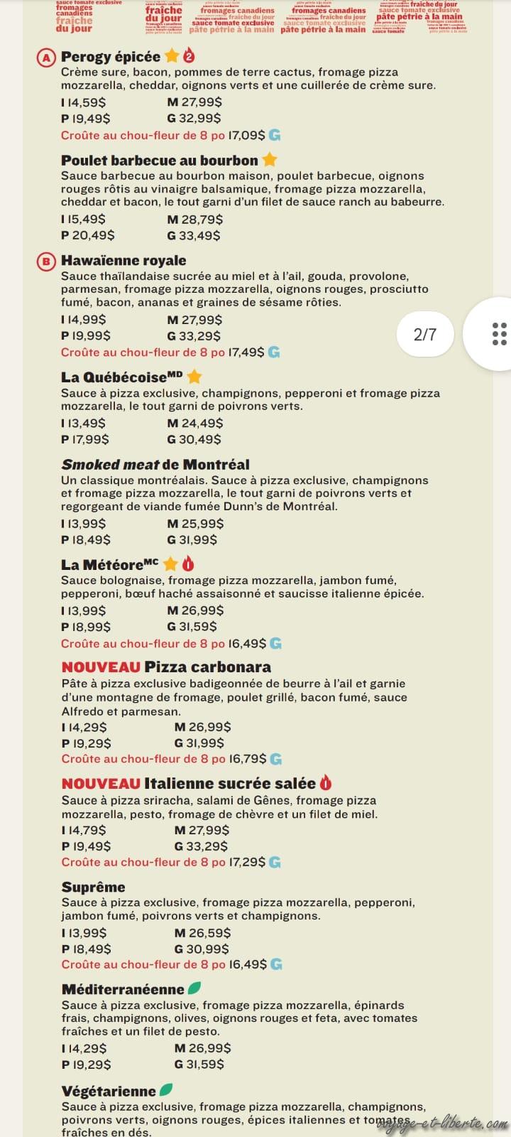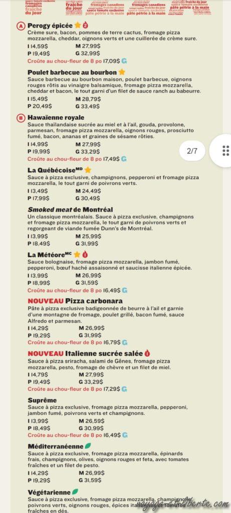 En ce samedi 17 juin, nous avons rendez-vous dans une pizzeria avec des amis de Jérôme, mais pour s’y rendre, encore faut-il comprendre les règles de circulation : il y a des « 4 stops à l’américaine » tous les 100 mètres (l’équivalent canadien du « tope » mexicain hihi) et des feux de circulation qui ont un « vert clignotant ». Dans nos esprits cela signifie « traversez en faisant attention à la priorité à droite », mais les klaxons des québécois nous laissent deviner que nous sommes à côté de la plaque. En effet, nous apprendrons plus tard que le feu vert clignotant veut au contraire dire que nous sommes « super prioritaires », bueno… Toujours est-il qu’à force de stopper à chaque instant, pour un oui ou pour un non, nous arrivons en retard ! Il nous reste à choisir une pizza mais, pour un français (et un italien aussi, je présume), le choix est rocambolesque hihi. Laquelle auriez-vous mangée ?!