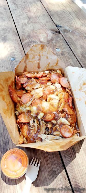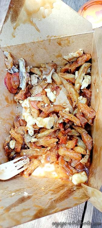 A midi, pour ne pas mourir bête, nous revenons vers le « Plateau » pour aller déguster une « poutine » dans un établissement renommé. Misère. Il est midi et une queue de 30 mètres nous précède. Plus nous attendons, moins j’ai finalement envie de déguster ce « met » typiquement canadien : des frites croulant sous le fromage qui fait « chwiq chwiq sous la dent », le tout arrosé de 2 sauces différentes au sel. On peut y rajouter d’autres ingrédients comme du poulet ou de la saucisse. Bref, ça tient au corps. Jérôme, en commande 2 grandes pour 3. Nous ressortons avec – sans exagérer – au-moins 4 kilos de bouffe dans les bras. A la première bouchée, je constate que je déteste. Jérôme et Carlito sont plus enthousiastes que moi, mais malgré tout, en unissant tous nos efforts, nous ne parvenons qu’à en avaler une sur deux. C’est gras, salé et roboratif. Never again pour moi (désolée amis canadiens ^⁾.