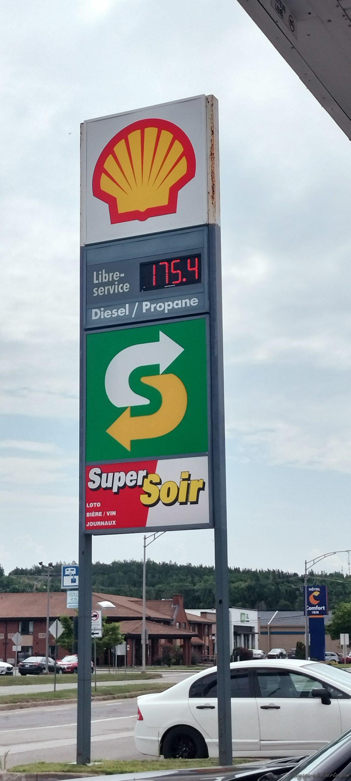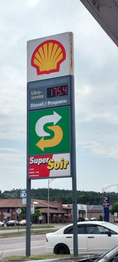 Nous partons prendre de l’essence un peu angoissés, ne sachant pas ce que nous allons payer. C’est en réglant la facture que nous comprenons que les prix s’entendent au litre et sont affichés en centimes de dollars canadiens (179,4, ça fait donc 1,794 dollar canadien) : mais pourquoi donc cette coquetterie hilarante ?!