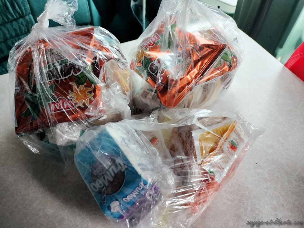 De fait, comprenant qu’il ne faut pas vexer un Cerbère de bonne volonté si on veut continuer à pouvoir venir se doucher, nous repartons avec nos petits sacs. Surprise ! Leur contenu n’est pas mal du tout : une briquette de lait, des fruits coupés en morceaux, un sandwich au fromage et des carottes crues destinées à être trempées dans une barquette de hummus. C’est un repas équilibré et sans junk food ! Bon … il y a quand même un petit paquet de chips, mais on va dire que ça ne compte pas .