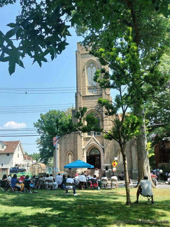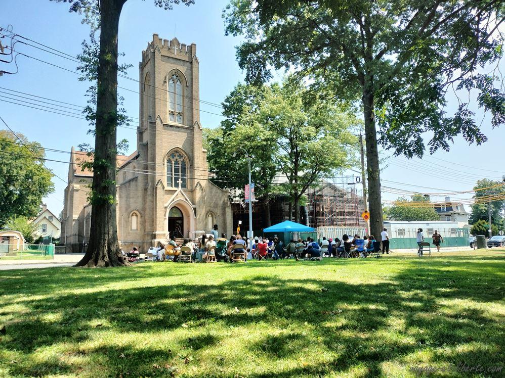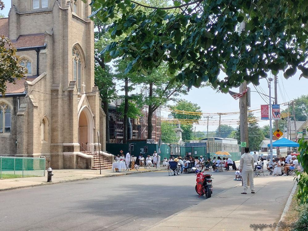 Je vais voir et constate qu’une communauté afro-américaine toute vêtue de blanc assiste à une messe en plein air qui a lieu dans une rue fermée par des barrières, l’église devant elle, un parc dans son dos. Dans ce dernier, un certain nombre de mexicains sont assis, indifférents à l’office. Je me place avec eux et observe. Je suis la seule touriste.