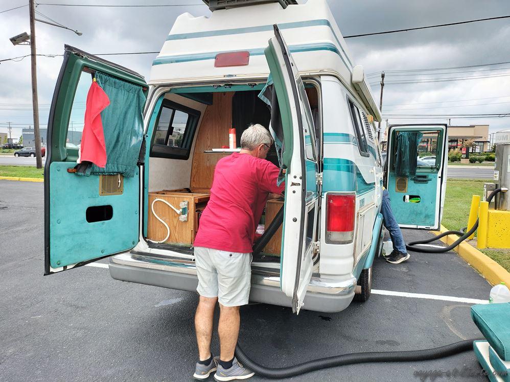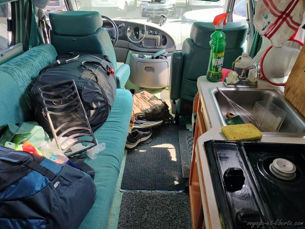 Il nous reste pas mal de choses à faire, dont laver le van. Nous sommes dans une station-service, toujours dans le même quartier où nous avons dormi, entrain de passer l’aspi, quand 2 dames viennent poliment nous demander de reculer un peu pour qu’elle puisse accéder au compresseur d’air pour les pneus. Pas de souci, nous nous exécutons sur le champ.