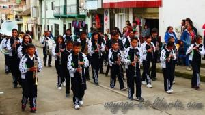Le village d’à côté est en fête « municipale ». C’est son 113ème anniversaire et des fanfares défilent dans la rue au son … de « La colegiala » (of course) ! A défaut de café, nous nous rabattons sur une assiette de cochon et de choclo, un peu stupéfaits de voir le nombre d’enfants jouant dans les fanfares. Ici la musique est prise au sérieux ! Toutefois, nous restons encore plus pantois devant une escouade de jeunes assurant la sécurité publique auprès de la police. Comme nous nous en étonnons, on envoie chercher le commissaire en chef qui, très gentiment, vient nous expliquer que les enfants de 7 à 14 ans peuvent se porter volontaires pour appuyer la police lors de manifestations publiques. Curieuse façon de faire de l’instruction civique !!