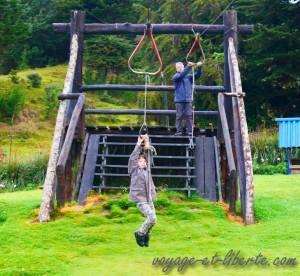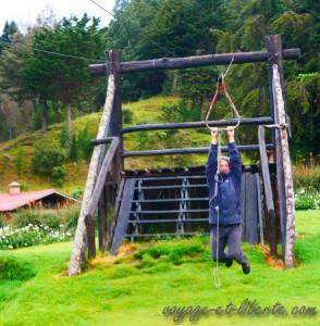 Le soleil revenu, nous en profitons pleinement. Carlito, en forme, se laisse tenter par la tyrolienne. Une fois, deux fois, cent fois … Jusqu’au moment où il tombe brutalement de trois bons mètres de haut, à plat ventre. Pffff … Je viens de renouveler le matin même notre assurance rapatriement, mais a-t-on vraiment besoin de l’essayer ??? Nous nous précipitons vers lui. Le souffle coupé il peine à se relever. Par chance, le terrain était meuble et l’enfant relativement élastique. Plus de peur que de mal.