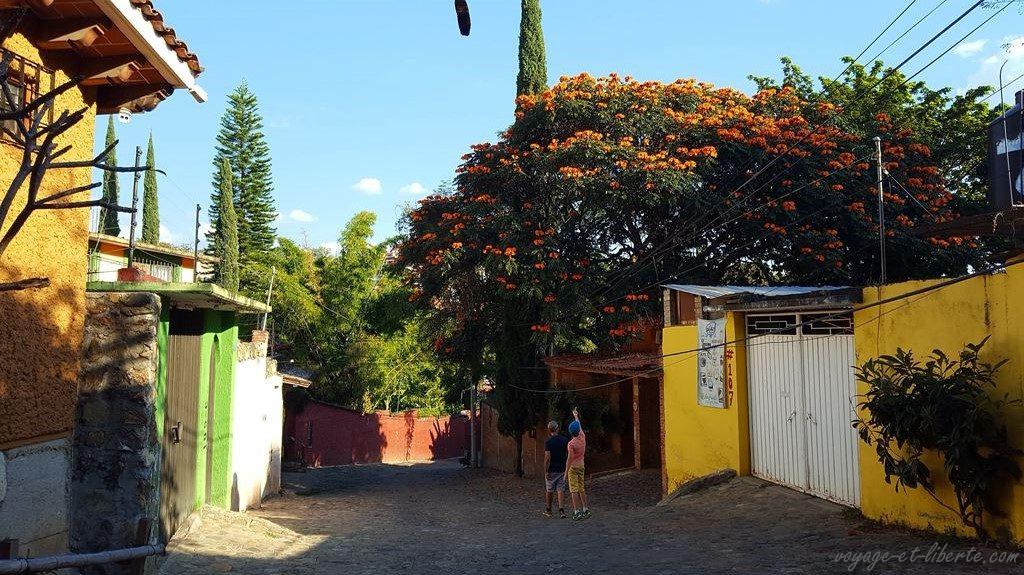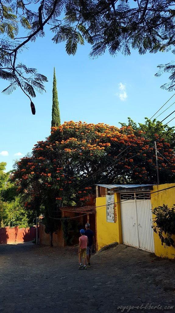 Au petit matin nous quittons Coyacan pour Oaxaca. En bus « ADO ». C’est beaucoup moins cher qu’en avion et avec un peu de chance, le plafond sera plus solide. Certes, c’est un bordel pas possible pour comprendre où prendre le bus en question, mais une fois le jeu de piste mené à bien, c’est impeccable ! 7 heures de route plus tard, nous arrivons à Oaxaca, , les fesses préservées par des sièges bien moelleux mais les oreilles à l’agonie à cause du son assourdissant des télés … provenant du plafond.