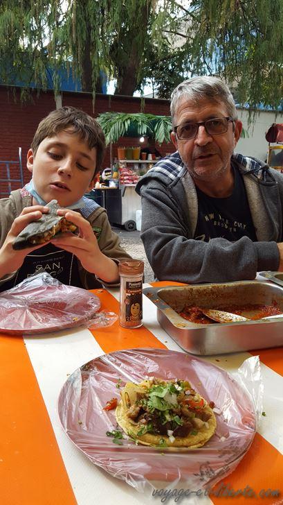 Nous passons une première nuit dans la banlieue chic de Mexico, à Coyacan. J’avais un peu espéré visiter le musée Frida Kahlo, mais il était fermé. Bon, on se console en mangeant nos premiers tacos du séjour (toujours avec le petit folklore du district fédéral consistant à enrober les assiettes dans des sacs plastiques jetables pour ne pas avoir à faire la vaisselle). Bonheur !