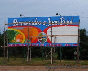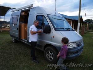 Ensuite on a rejoint l’Argentine et roulé, roulé, roulé … A tel point que samedi en fin d’après-midi, on était mal embarqué : à 17 heures on avait toujours pas trouvé d’endroit pour dormir, à part les parkings de stations service bordant la route 14 : humm le rêve !! De guerre lasse, on a bifurqué sur une mauvaise piste de 13 kms et nous sommes arrivés dans le petit village de Juan Pujol sans hôtel, sans camping, aux rues en terre battue (mais avec une très jolie et grande place centrale dallée et fleurie qui contrastait beaucoup avec le caractère rustique des rues)… On s’est calé sur la pelouse entre la bibliothèque et l’église, on a prévenu la police de notre campement improvisé et là, miracle du voyage, les autochtones nous ont immédiatement adopté.