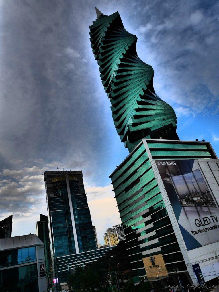 Derrière nous se dresse le quartier de Punta Pacifica qui abrite la célèbre « Trump Tower », la plus haute et plus moderne tour de Panama. Nous aurons l’occasion de la visiter. Comme le certifie Charles : c’est pas plouc ! On peut d’ailleurs en profiter soit en achetant un appartement, soit en prenant une chambre dans le luxueux hôtel qui occupe une partie de la tour, soit en entrant incognitos dans la partie publique de la tour. Du coup, nous, on s’est contenté de profiter des salons