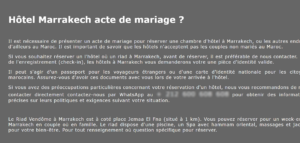 A l’arrivée celle-ci prend nos passeports et nous installe gentiment. Je finis par m’enhardir à lui poser la question. Mi-amusée, mi-sérieuse, celle-ci m’apprend alors que ce n’est pas vraiment obligatoire pour les étrangers visitant le Maroc, mais seulement pour les ressortissants marocains. De plus en plus étrange … Et pourquoi donc ?! Car c’est la loi ! En effet, dans un pays où l’Islam est religion d’Etat, l’article 490 du code pénal interdit les relations sexuelles hors mariage, en faisant un délit d’immoralité passible d’amendes ou de prison. Pour éviter que des couples « illégitimes » ou, pire, des prostituées ne louent des chambres d’hôtel ou des appartements, il est donc exigé un acte de mariage à l’entrée…
