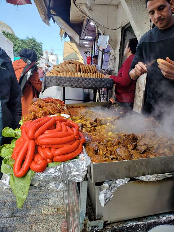 Comme en Amérique latine, au Maroc, on trouve des commerces ouverts très tard et des snacks partout. Jamais de la vie tu te demandes « est-ce que ça va être ouvert ? » : ce le sera (sauf pendant le Ramadan, j’y reviendrai) ! Et en plus, tu n’as pas qu’un choix de kebabs ou de « tacos » (ce sandwich  mêlant viande et frites assaisonnées de sauces industrielles et usurpant le nom de « tacos » à la gastronomie mexicaine sans lui rendre hommage) : en bas de chez moi, le snack cuisine tous les soirs des poulets rôtis, de la soupe harrira et des tajines pour des prix vraiment modiques.