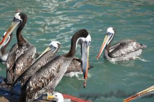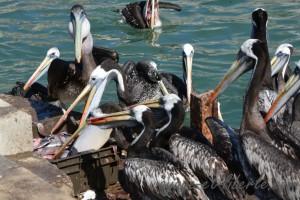 Attirés par les marchands de poissons qui rejettent à l’eau les restes de poissons et de coquillages, une véritable danse animalière s’organise, les pélicans et les otaries se taillant une part de roi, tandis que les mouettes attendent de manger les restes !
